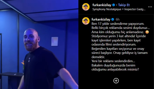 Furkan Kızılay, sosyal medya hesabı üzerinden yayınladığı bir videoyla 17 yıldır seslendirme sanatçılığı yaptığını takipçileriyle paylaştı. Kızılay, paylaşımında, “Ben 17 yıldır seslendirme yapıyorum. Belki birçok reklamda sesimi duydunuz ama kim olduğumu hiç anlamadınız,” ifadelerini kullandı. Yerin üç kat altındaki stüdyosundan seslenen Kızılay, seslendirme sürecinin inceliklerini de anlattı.
